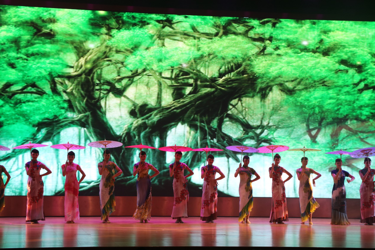 附属广州歌舞团的舞蹈演员身着绚丽的服装,手持花型伞,一颦一蹙,尽显花城的独特韵味。