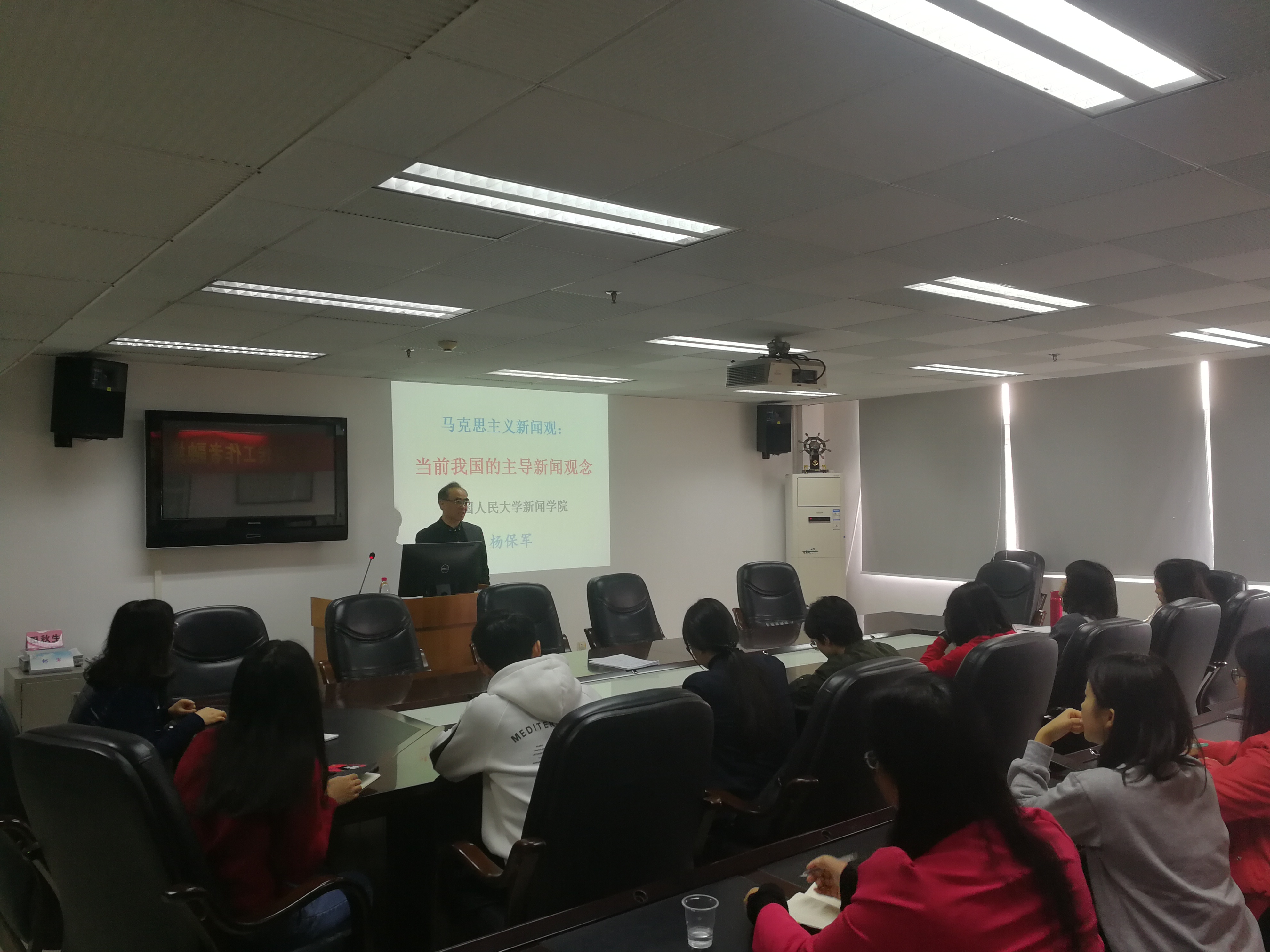 师生主讲了题为《马克思主义新闻观:当代中国的主导新闻观念》的讲座。讲座由李雁书记和李春雷副院长主持,部分老师与同学们听取讲座。
