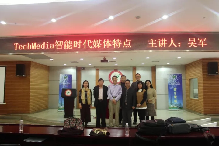 11月29日上午9:00,腾讯前副总裁吴军在行政西楼二楼会议厅举办以“TechMedia智能时代的媒体特点”为主题的讲座,参与本次讲座的有院长田秋生、党委书记李雁、党委副书记林仲英和二级教授欧阳常林。