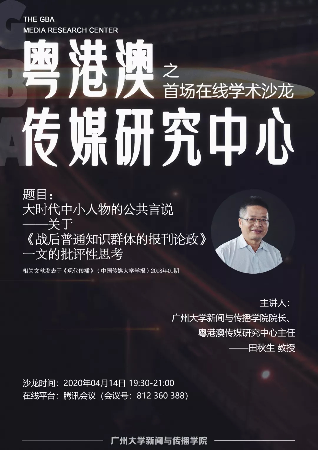 4月14日晚上,粤港澳传媒研究中心首场在线学术沙龙顺利举行,中心主任田秋生以“大时代中小人物的公共言说”为题,对自己的研究论文《战后普通知识群体的报刊论政》进行了批评性思考,60多名团队成员与研究生同学参与了此次沙龙。
