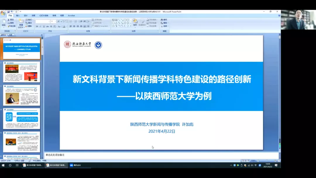 院长许加彪教授,首先从对新文科背景下新闻传播的学科特色建设和人才特色培养两个方面,进行了理论阐释和经验分享。许院长结合去年发布的《新文科建设宣言》,认为中国的“新文科建设”,是指建设以马克思主义为指导,具有中国特色、中国风格、中国气派的哲学社会科学学科体系。