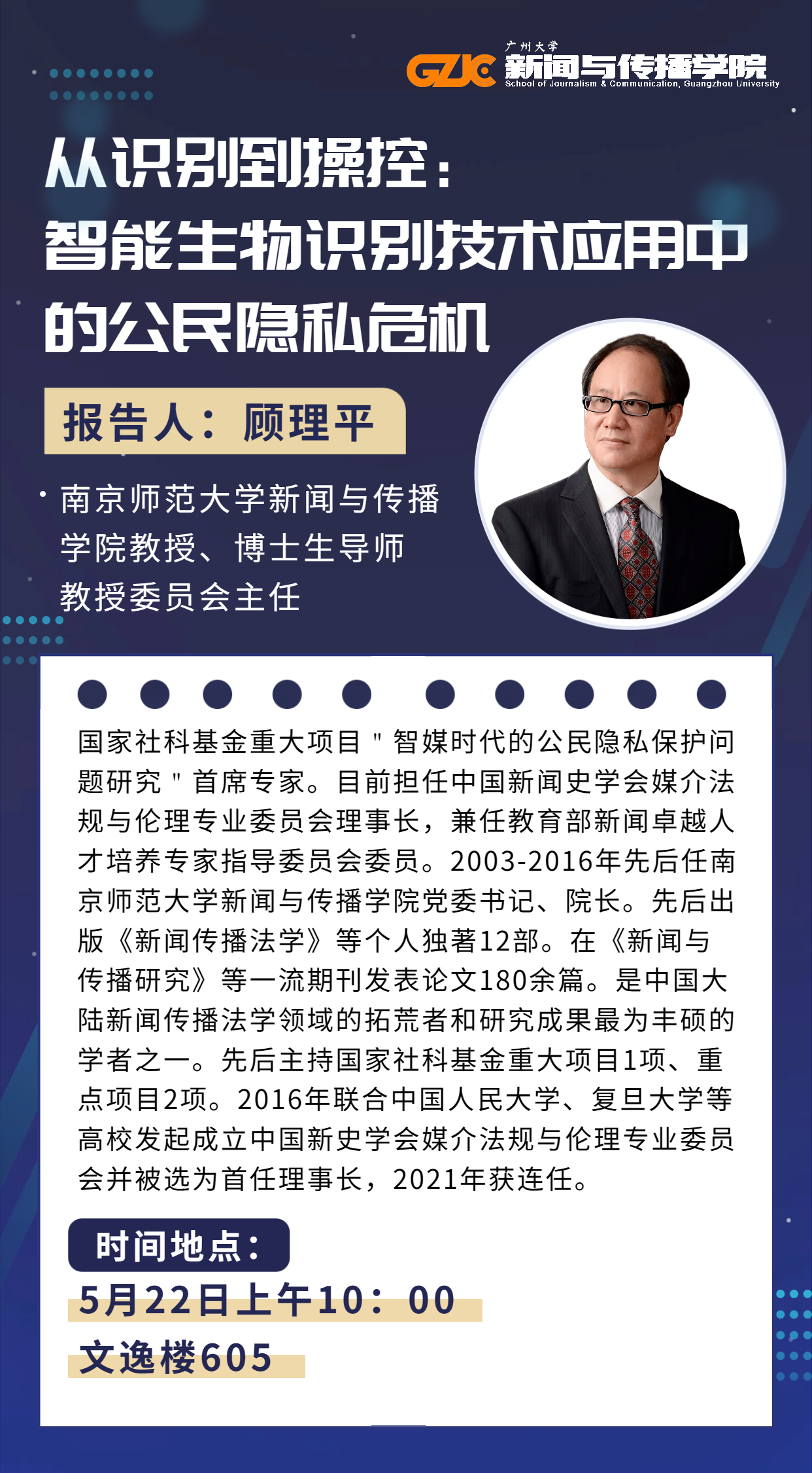 【讲座预告】2023年5月22日顾理平教授《从识别到操控:智能生物识别技术应用中的公民隐私危机》