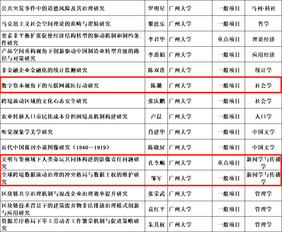 今年立项国家基金项目共4项,包括一项重点项目,两项一般项目和一项青年项目。其中,孔令顺老师的《文明互鉴视域下人类命运共同体构建的影像责任问题研究》课题获得重点项目立项;陈璐老师的《数字资本视角下的互联网就医行动研究》和邹军老师的《全球跨境数据流动治理的冲突格局与数据主权的维护研究》课题获得一般项目立项;章玉萍老师的《生命历程视角下残障者媒介生活与传播困境研究》课题获得青年项目立项。