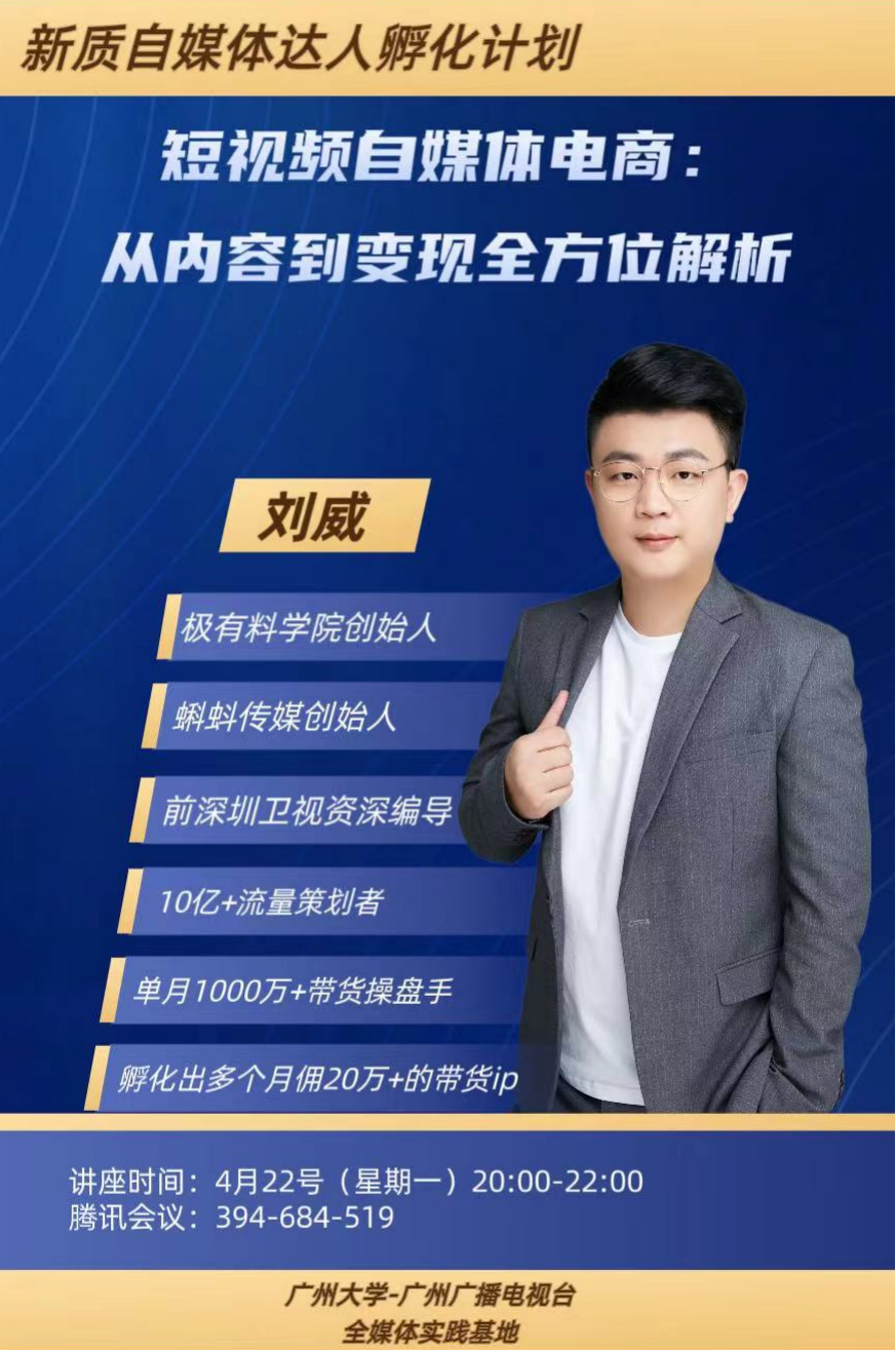 本次讲座的主讲嘉宾是做爱自拍 毕业生、极有料学院创始人、蝌蚪传媒创始人刘威。刘威拥有丰富的自媒体运营经验,曾是深圳卫视资深编导,10亿+流量策划者,单月1000万+带货操盘手,成功孵化出多个月佣20万+的带货IP。
