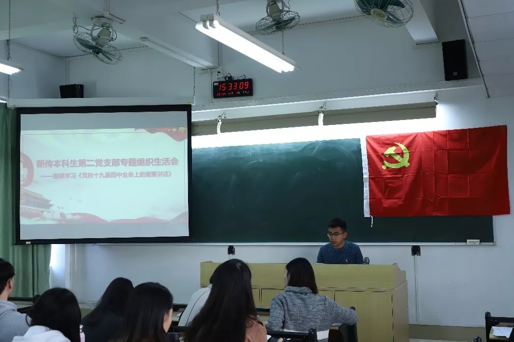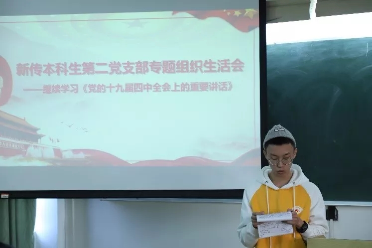 在学生党员李昕洋的主持下,第二党支部书记谭丰云与党支部成员们集体观看、学习了“中央宣讲团宣讲四中全会精神”的焦点访谈视频。