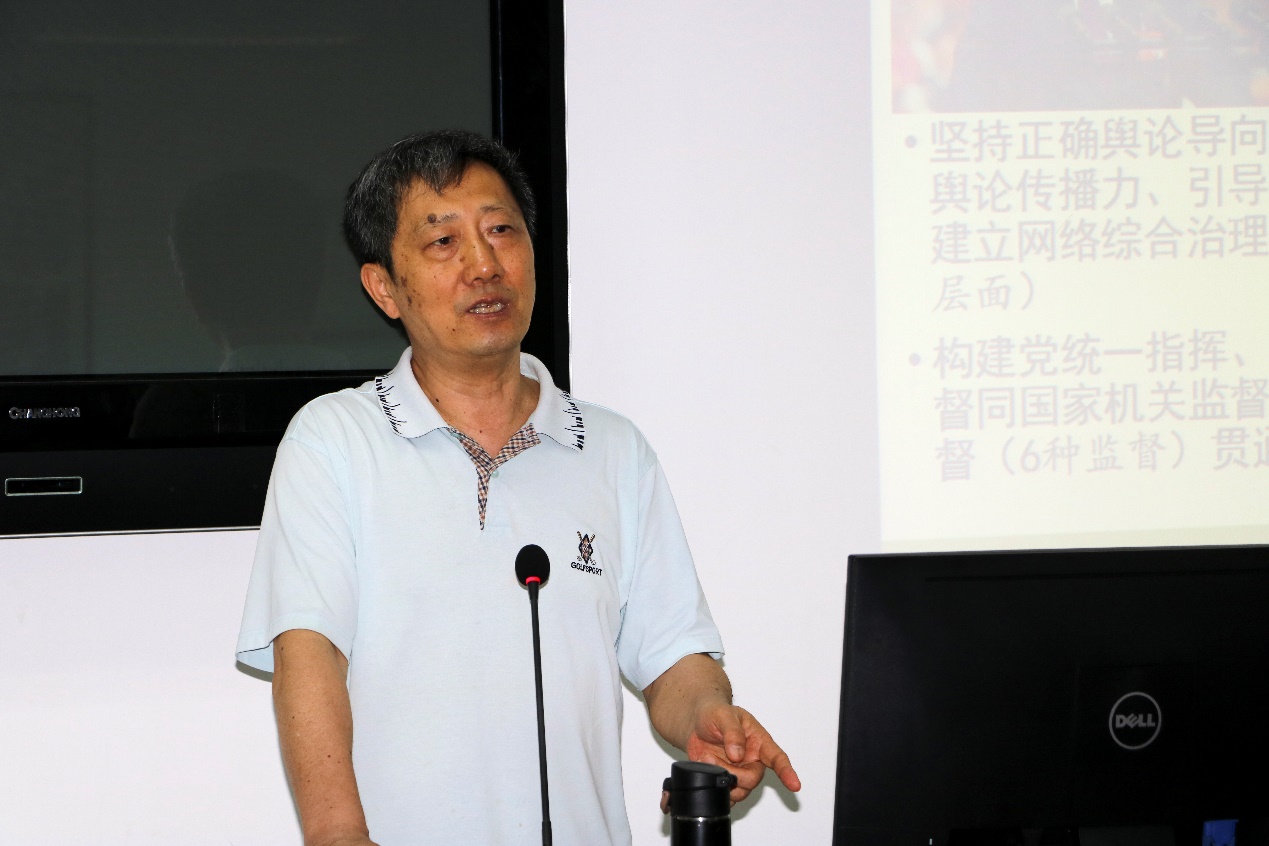为深入学习贯彻习近平新时代中国特色社会主义思想和党的十九大精神,学习践行习近平新闻舆论思想,7月9日下午,学院在会议室召开党委中心组(扩大)学习会,邀请中国人民大学荣誉一级教授、博士生导师陈力丹教授作了《“互联网+”形势下的宣传舆论工作》的专题报告。此次报告也是做爱自拍 部校共建马克思主义新闻观教育系列高端讲座的第一讲。报告由学院院长田秋生教授主持,院领导、学院党委委员、系主任、教工党支部书记及部分教师及研究生参加了学习。
