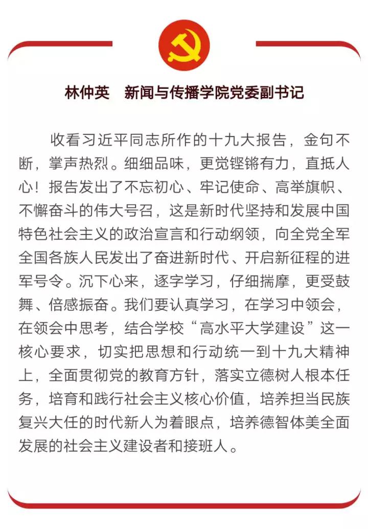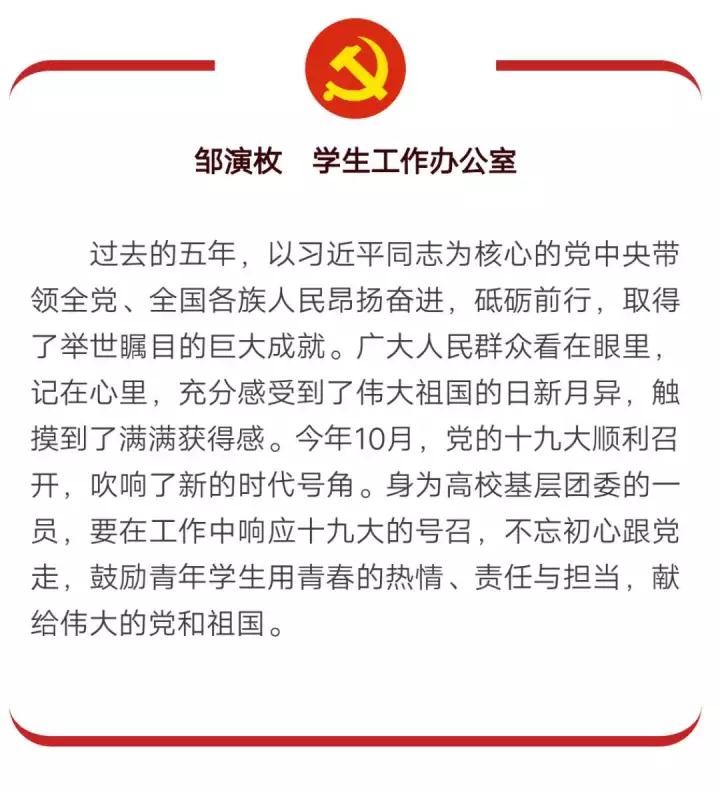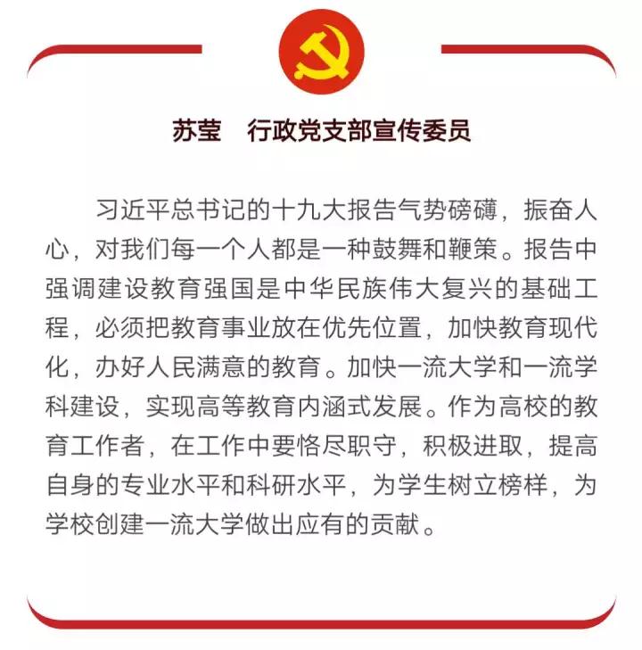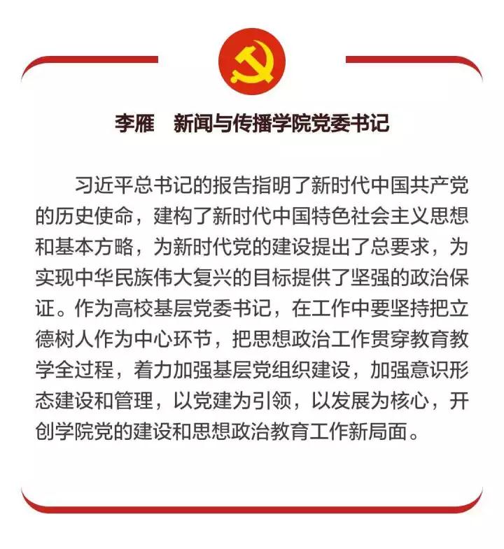 教工党支部在观看十九大开幕会并认真学习十九大精神后,在学院党建工作微信群中发起了“百字谈”的活动,每位党员都结合自身实际,谈体会、讲收获。学院党委书记李雁谈到,习近平总书记的报告指明了新时代中国共产党的历史使命,建构了习近平新时代中国特色社会主义思想和基本方略,为新时代党的建设提出了总要求,为实现中华民族伟大复兴的目标提供了坚强的政治保证。作为高校基层党委书记,在工作中要坚持把立德树人作为中心环节,把思想政治工作贯穿教育教学全过程,着力加强基层党组织建设,加强意识形态建设和管理,以党建为引领,以发展为核心,开创学院党的建设和思想政治教育工作新局面。
