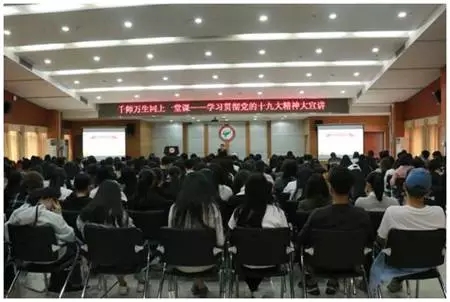 院长田秋生、学工办主任张丽芬以及17级辅导员高莹莹也出席了本场宣讲。围绕“深入学习贯彻党的十九大精神”主题,张强副书记介绍了党的十九大概况,并向同学们