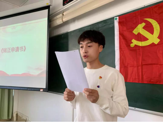 由董泽扬同学宣布基本情况后大会正式开始,首先全体起立奏唱国歌。随后,5名预备党员同志轮流上台宣读《转正申请书》,就自己过去一年的学习、工作和生活情况进行认真总结,并大胆指出自身不足,像理论没有与实践很好结合、性格浮躁、安排不合理等问题普遍存在,但每个人都表明了往后积极改正的决心。