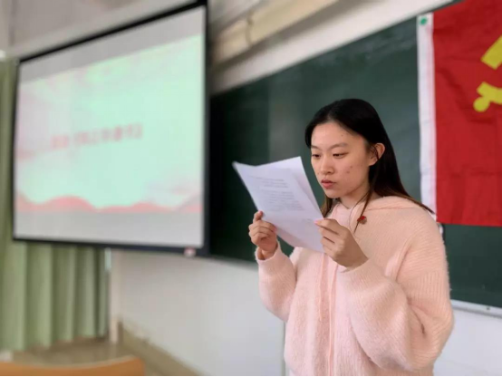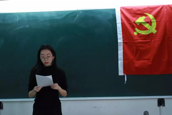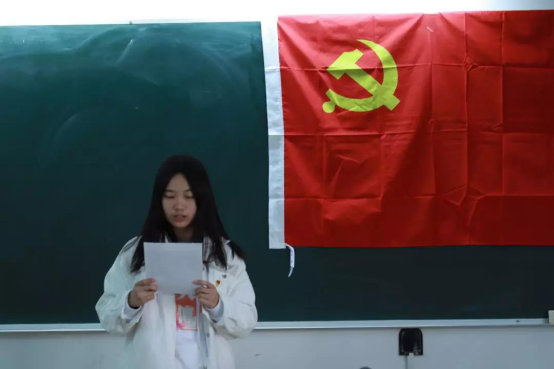 会议伊始,由第二党支部的学生党员陈宜通报大会基本情况并宣布大会正式开始。随后全体起立,奏唱国歌。随后吴嘉铃、林茵欣、闫霖娇同学先后宣读了自己的入党申请书且汇报了自身情况,并由入党介绍人介绍申请人的情况。