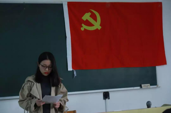 在经与会党员展开谈论,充分发表意见后,进行支部成员进行不记名投票表决。根据投票结果,同意接收吴嘉铃同学为中共预备党员,通过了第二党支部陈梦如等6名预备党员转正的决议。随后三位同学面对党旗,庄严地宣读了入党誓词。
