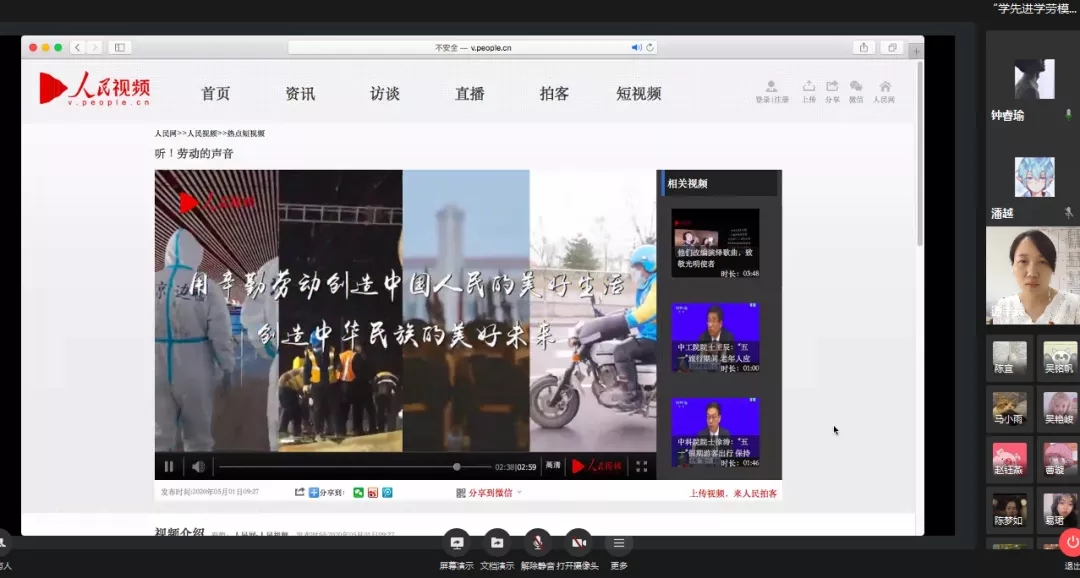 其中,学生党员欧阳沛妮结合自身实习期间策划的微纪录片经历,向大家讲述了消防员战士由浩杞的故事。通过视频展示了由浩杞的从业历程,大家从中了解到消防事业的艰辛与高风险性,更为他对国家和人民的强烈的热爱与奉献精神所感动。欧阳沛妮同学表示除了像由浩杞这样的消防战士,还有许许多多数不清的劳模。疫情期间的医生护士、科研专家们等等,这些用自己的专业知识和技能与人民同呼吸、与祖国同命运,都是自己学习的榜样。她希望通过学习劳模来激励自己,坚信自己通过不断的努力学习和实践,也终将从一名民族复兴的时代新人变成一名光荣的劳模。