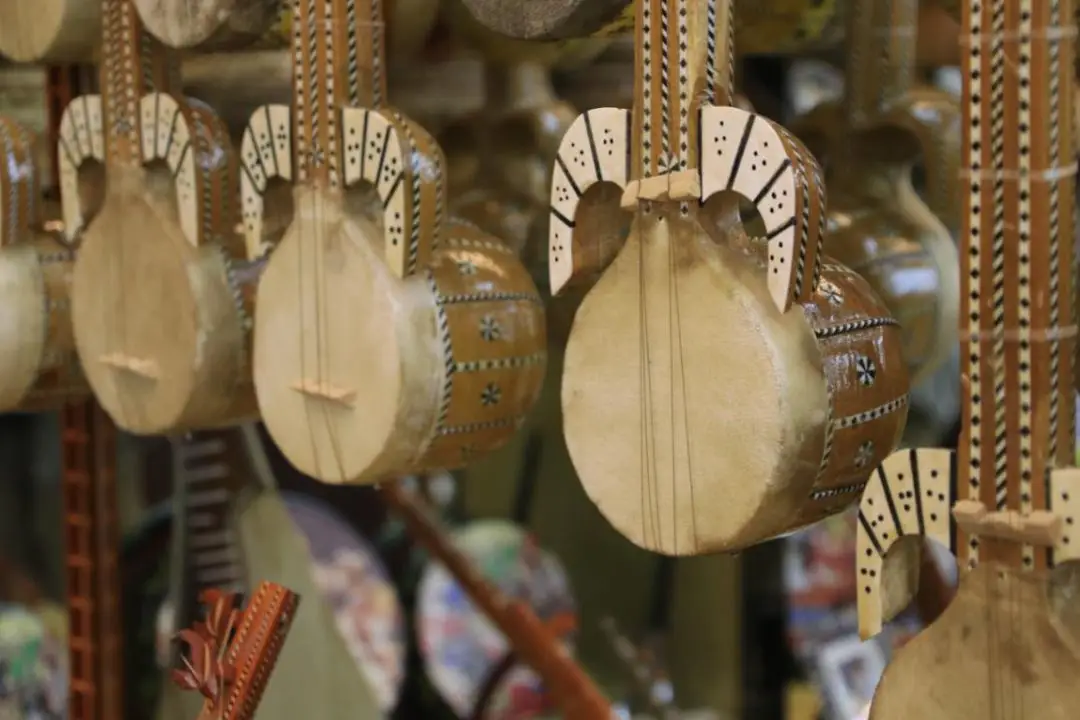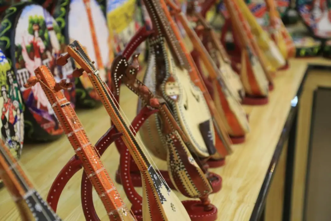 博物馆中排布整齐,精心制作的民族乐器都塔尔