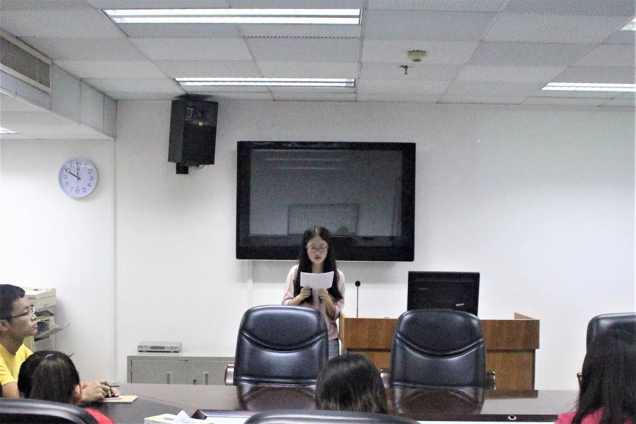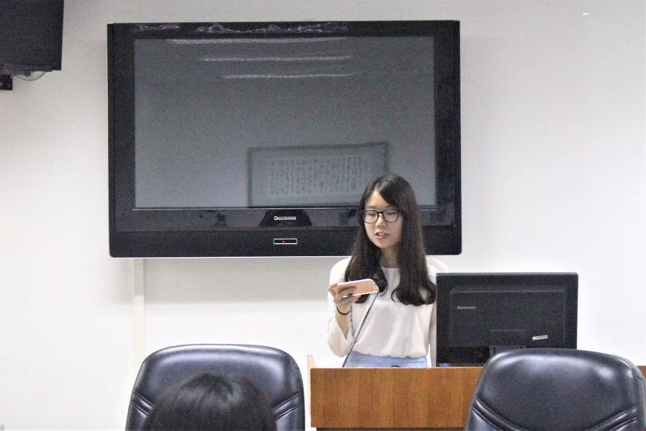 学生会副秘书长郑煜媛主持大会。她首先向大家宣读预备人选名单,并说明了大会流程和注意事项,其中包括预备人选上台发表竞选演讲和学生代表投票产生16位学生代表。