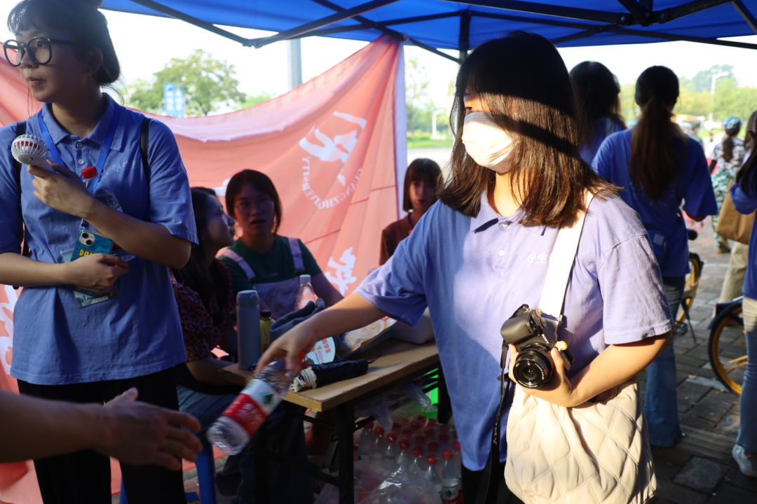 医疗服务保障点的导生和工作人员清晨七点就准备好水、药膏和葡萄糖等物资在摊位迎接同学们,为同学们做好后勤保障工作。