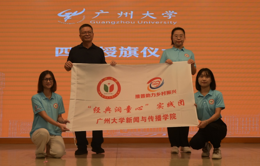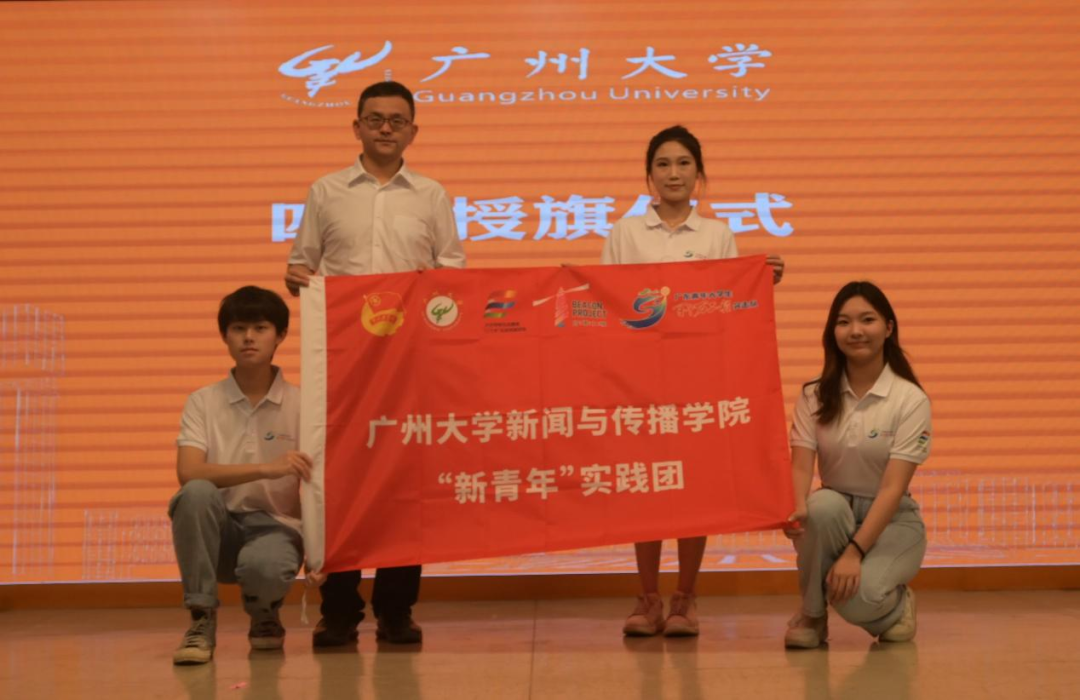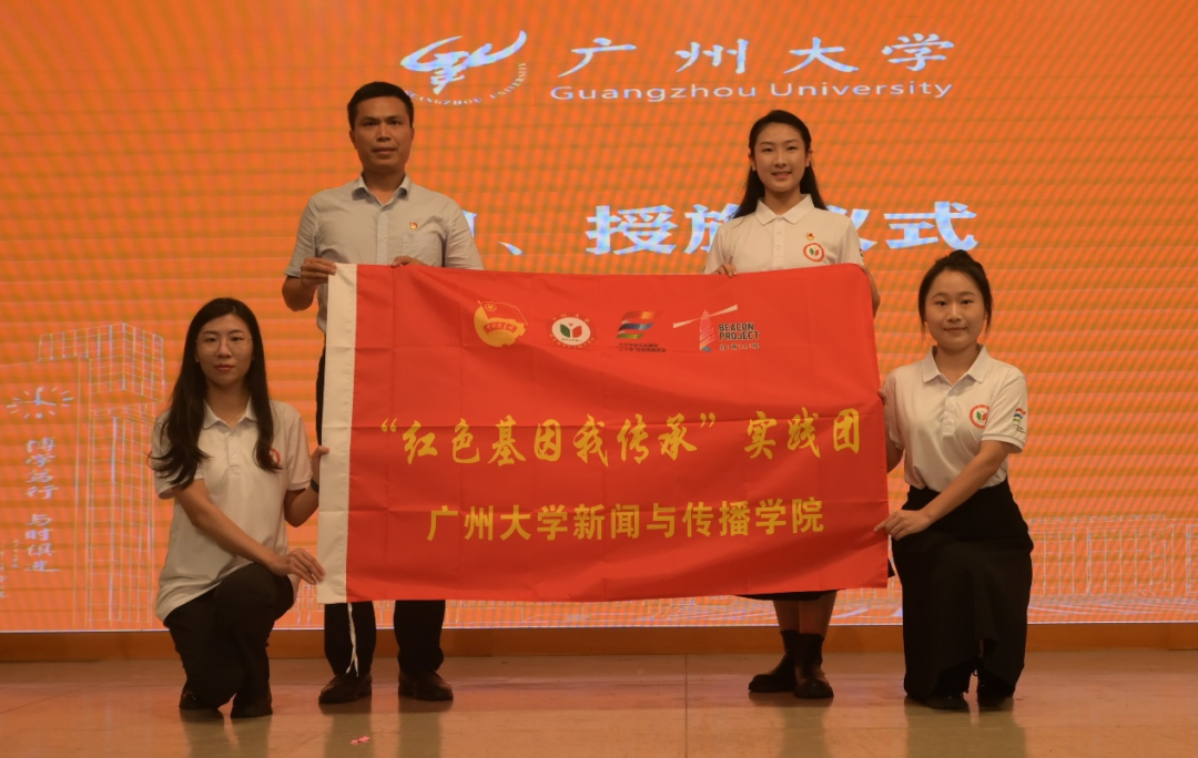 最后,广州市委宣传部李亚卫调研员、校团委冯锐书记、校学生处廖勇副处长、田秋生院长分别为“湾区青年湾区行”实践团、融媒体内容生产“新青年”实践团、“红色基因我传承”实践团、“经典润童心”实践团授旗。