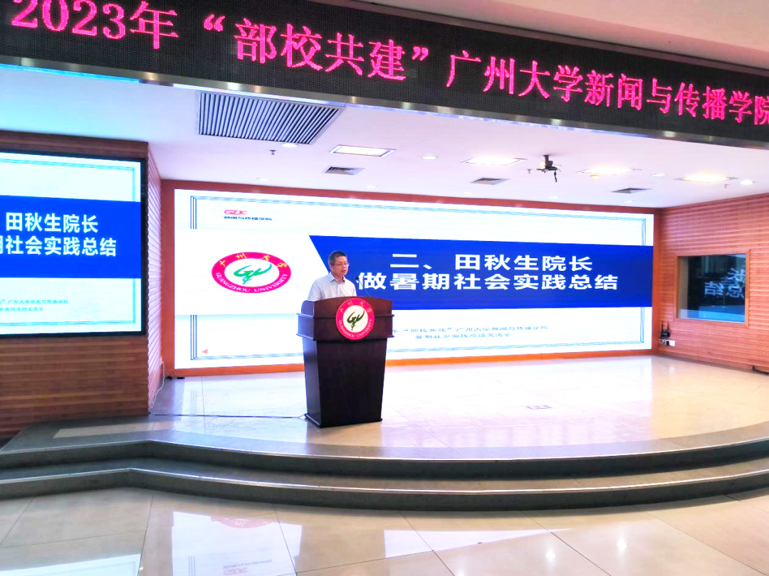 随后,田秋生院长对本次暑假社会实践活动进行了总结,并回顾了往年的暑假社会实践情况。他指出,今年的暑期实践,学院延续了一直以来的暑期实践理念:一是依托并服务于国家战略,包括粤港澳大湾区发展战略、乡村振兴战略、县级融媒体建设战略等。二是德育教育与专业教育相结合,带着明确的主题,开展社会调查、新闻采制,在提升专业技能的同时,开展国情教育、党史教育、马克思主义新闻观教育。三是师生同行,将课堂搬到工厂车间、田间地头,让社会实践带上泥土的芳香,让同学们触摸到大地的脉搏。