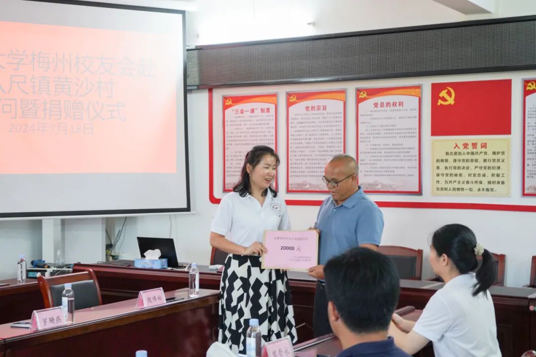 梅州校友会罗珊燕会长向黄沙村送上支援灾后重建慰问金20000元,以实际行动积极支持基层一线复工复产。
