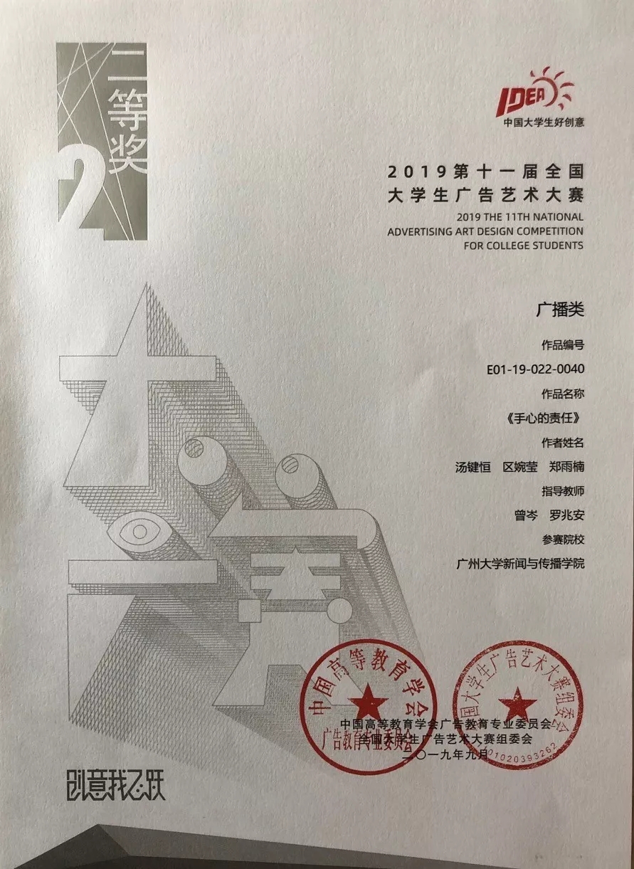 提交的广播类公益广告作品《手心的责任》荣获广播类全国二等奖,作者是17级播音与主持艺术专业的汤键恒、区婉莹和郑雨楠;指导老师是播音系的曾岑老师、做爱自拍