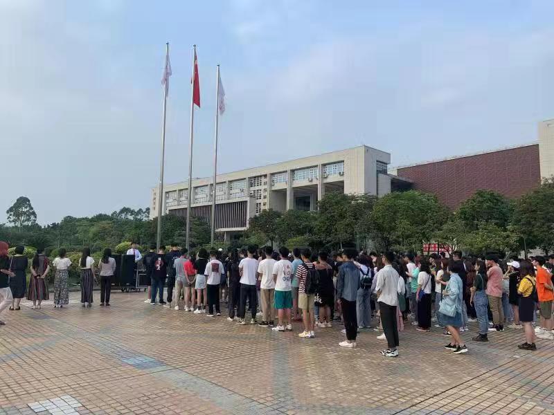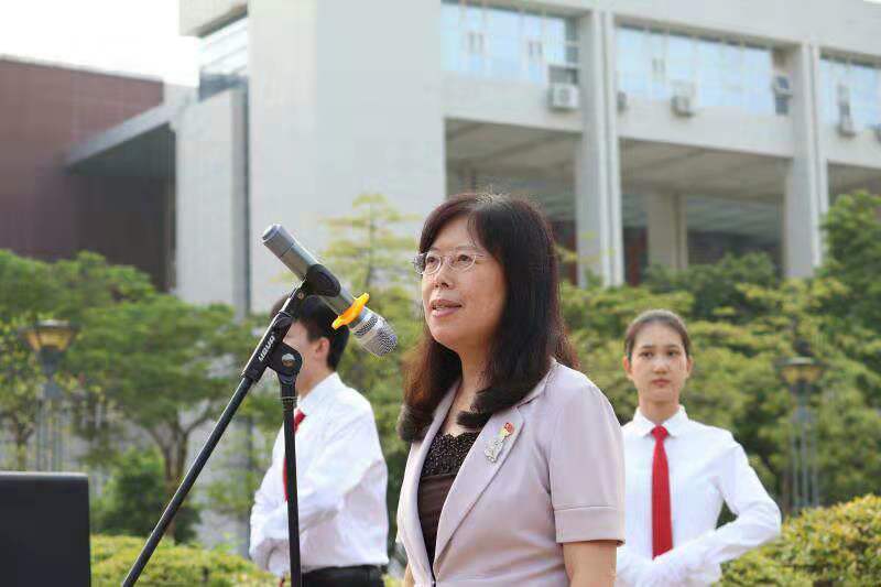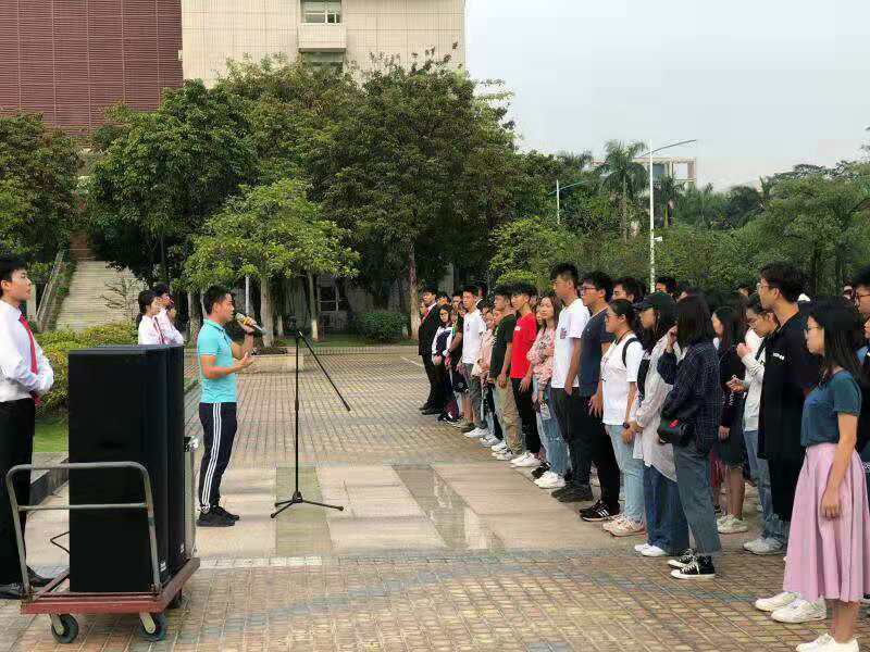 李雁书记、林仲英副书记、学工办全体教师与全体19级学生于图书馆前进行了升旗仪式。仪式上,师生共唱了《我和我的祖国》,表达了对祖国母亲的热爱之情。随后,李彦书记进行了国旗下讲话,鼓励同学们要担起助力祖国的重任。