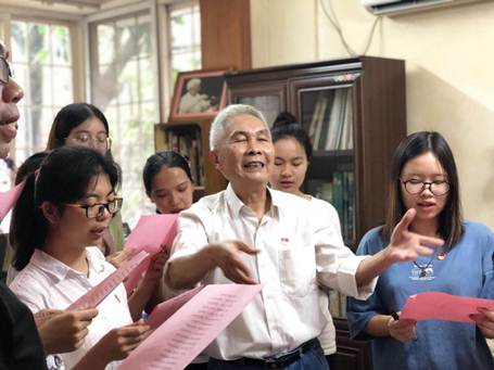 穿过一条小巷,学生们来到了高老的住所,高老正站在外面远远地向学生们挥手,他身着一件洁白的衬衫,配着一条浅蓝色的牛仔裤,要不是那花白的头发“露出马脚”,我们还真的看不出眼前这位精神矍铄的老人已寿登耄耋。