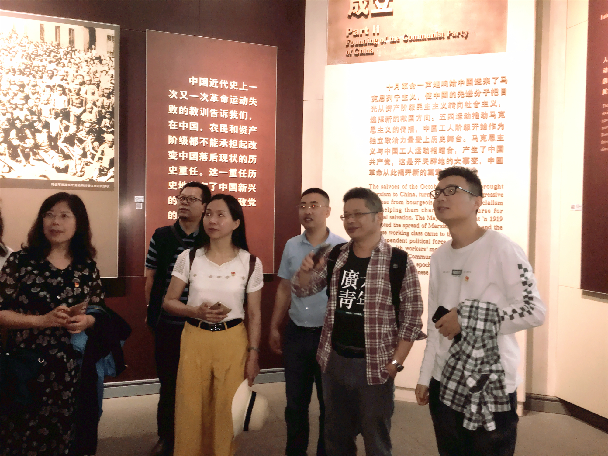 教师党员们首先来到南湖革命纪念馆。气势恢宏的序厅,穹顶上的铁锤镰刀分外醒目。一艘复建的红船破墙而出,似在告诉人们正是这一把橹桨摇醒了在茫茫黑夜中摸索了半个多世纪的中国。一桩桩感人故事,一件件历史文物,都让人感受到党的诞生和成长,一幅幅历史照片生动展示了中共先驱者为了中国的未来而抛头颅洒热血的史实。教师党员们通过大量的图片影像资料,深深感受到从中共一大到党的十九大,跨越98年的对话;感受到一条主线一脉相承——党的领导、党的建设,任何时候都要坚如磐石。从中共第一个纲领、第一份决议,到党的十九大报告,中国共产党带领人民一步接一步,从蓝图到现实,前所未有接近实现中华民族伟大复兴的梦想。不忘初心、牢记使命、永远奋斗——这是中国共产党人永葆青春活力的秘诀,这是一个肩负历史重托的政党对人民的承诺。