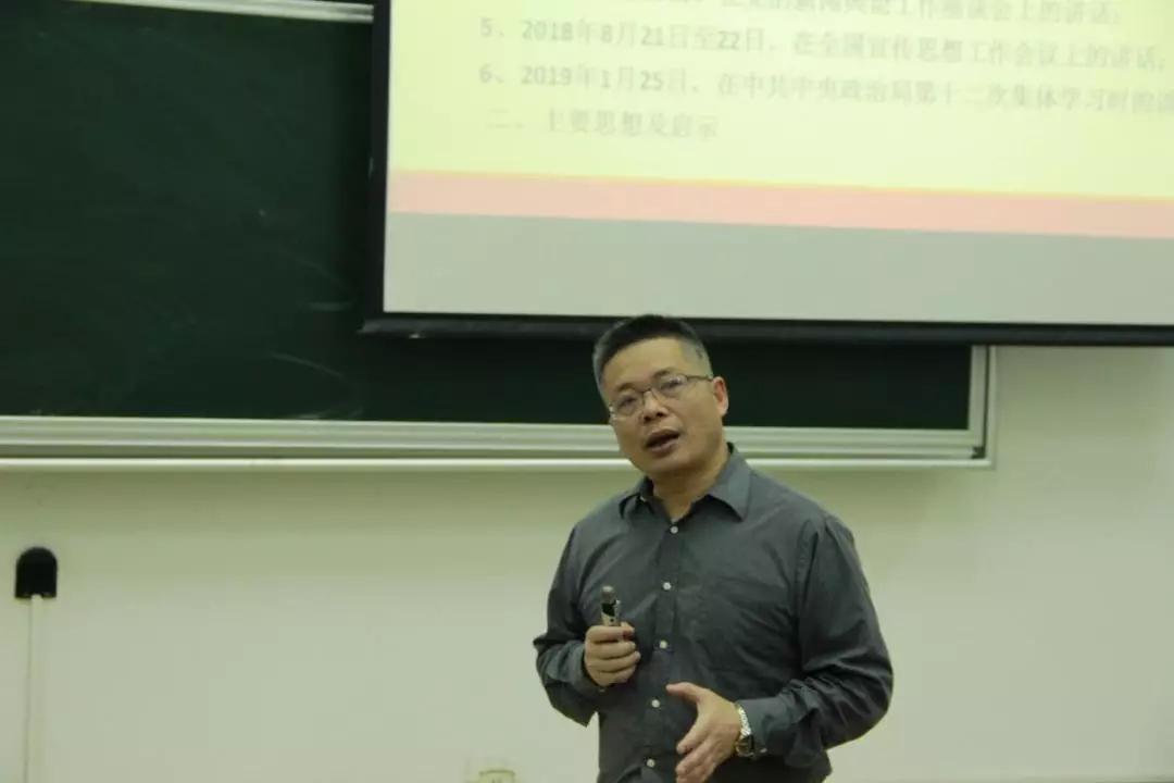 最后,田院长重点介绍了习近平总书记2018年在全国宣传思想工作会议及2019年在中共中央政治局第十二次集体学习时的重要讲话精神要点。他说,我们应始终坚持马克思主义新闻观,牢记新形势下举旗帜、聚民心、育新人、兴文化、展形象的宣传使命任务,讲好中国故事,传播好中国声音。