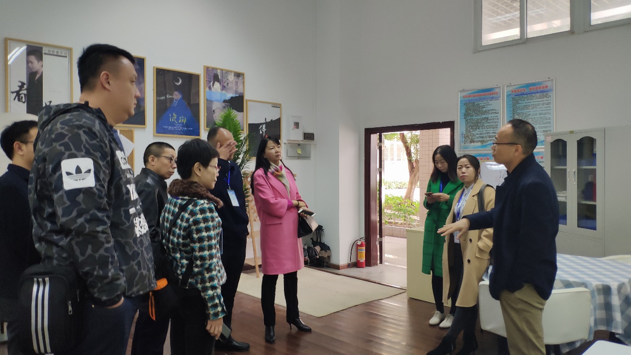 邹军教授(右一)给喀什宣传干部培训班学员介绍学院融媒体实验室建设情况