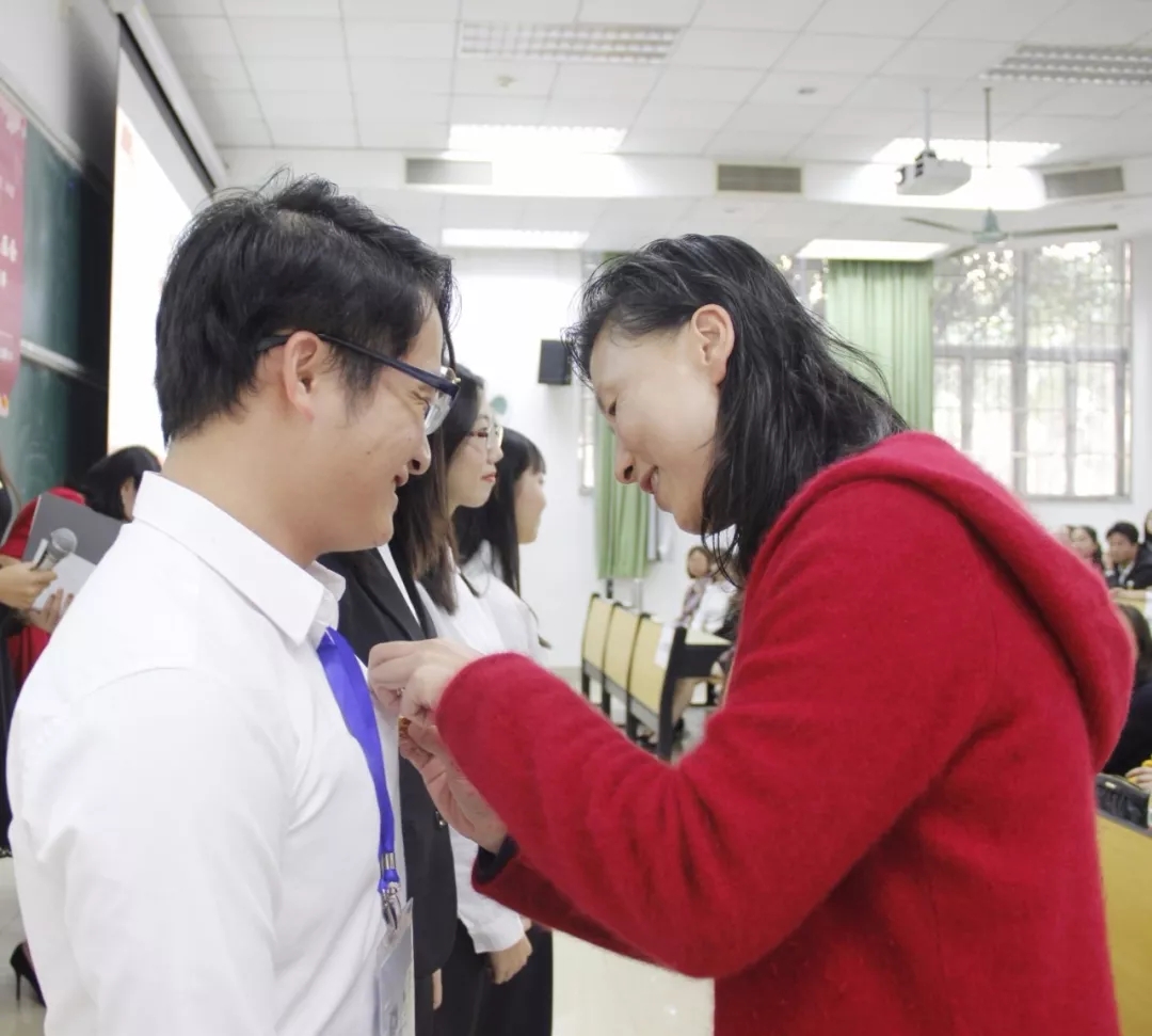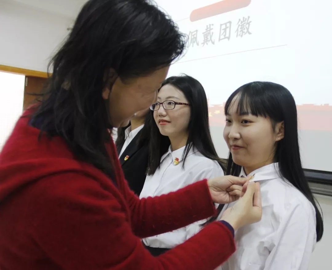 会议进行到第三个议程,由生命科学学院党委书记陈筠老师为各院青马代表佩戴团徽,期望同学们能牢记团员身份,践行团员使命,不忘初心,勤于学习,严于修身。