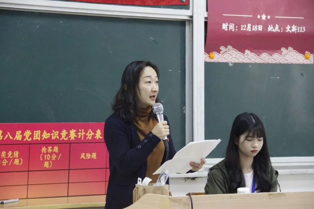 在见面大会结束后,四院还在现场举行了有趣的党团知识竞赛,提问青马班学院以及现场观众关于我们国家的,历史的,社会的一些小问题,现场同学们都积极参与,特别是有奖竞猜抢答环节,气氛更是热烈。在党团知识竞赛结束后,人文学院团委书记张立老师进行了总结发言,她希望大家积极学习党团知识,多读红色经典,继续发挥团员的先锋模范作用,在未来为国家、社会贡献我们自己的一份力量。