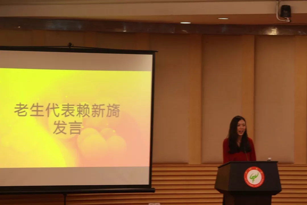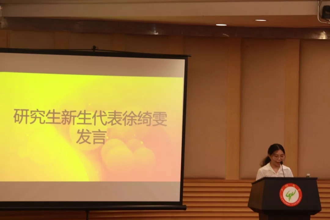 随后,徐绮雯作为研究生新生代表上台发言。她认为研究生是从一个了解自己拥有的知识到创造新知识的过程。她最后总结“一分耕耘,一分收获”并希望能与各位新生一同成长。