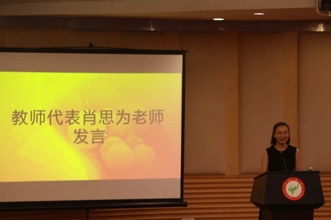 接着,老师代表肖思为老师上台发言。她以自己的经验和感受出发,向同学们阐述应如何成为一个上进的人:需要一个上进的环境、寻求有效的监督和目标具体化。
