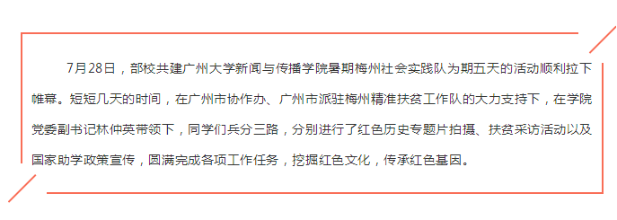 短短一周的社会实践,时间紧,任务重:实践过程中遇上了种种困难,舟车劳顿,顶着似火骄阳,实践团队出色地完成了任务。三组小分队收获的不仅是对梅州红色历史、精准扶贫、以及资助政策的认识,更有策划能力、专业采访能力、以及专题片摄制技巧等专业能力的提升。