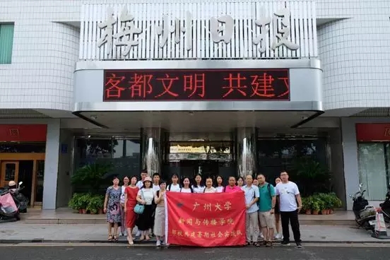 暑期实践队在梅州的第一站是媒体交流。实践队师生来到梅州日报和梅州电视台,就新媒体环境下传统媒体的转型发展、媒介经营以及人才需求等问题进行了交流,通过对两家媒体的实地参观,对传统媒体转型升级的具体措施有了更为深入的了解。作为地方性媒体,梅州日报和梅州电视台以客家文化的传播与传承为己任,并以此为基石,在当地客家群体中具有较大的市场占有率。