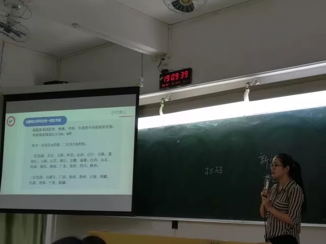 今天晚上7点,由广播艺术系老师魏晨婕博士主讲的第一场考研分享会在文新315室举行。魏晨婕老师的讲座主题为“砥砺奋进吧,少年!”,讲座分成“考研是什么”、“为什么要考研”、“考研流程”和“提问”,内容以雨课堂PPT的形式展示,期间学生可用弹幕参与到与老师的提问互动当中。
