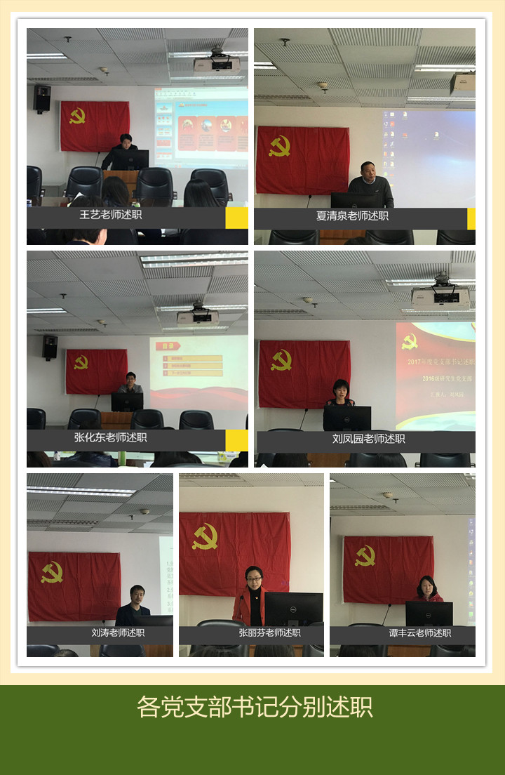首先是广告学系党支部书记王艺述职,他总结了党支部一年来推进学习型党支部建设,将专业建设的内涵与党建相结合,开展了“教书育人与高水平大学建设中的人才培养素质问题”,承办了中日广告学院广州巡讲会和时报金犊奖广东创意分享会,探索了人才培养的途径;广播电视艺术学系党支部书记夏清泉总结了党支部重视组织建设,分工明确,注重会议记录,并将学科建设与党建工作相结合的做法,开展了“戏剧与影视学”学科建设的讨论、参观了廉政展览等活动。新闻学系党支部书记刘涛介绍了本支部履行党建责任的情况,以及支部积极落实“三会一课”,结合专业开展调研与交流的经验分享;行政党支部书记张化东在述职中提到,党支部以理论学习为先导,助力推进“两学一做”,提高服务水平,严格“三会一课”制度,不断提高组织生活质量。他还提出支部工作中存在的主要问题及下一步工作要科学制定党建工作方法制度,创新组织生活形式,增加支部党员之间的交流等设想;2016级研究生学生党支部书记刘凤园介绍了个人履职情况,党支部在学习宣传贯彻党的十九大精神,注重组织建设,落实“三会一课”,积极推进党支部工作。并提出存在的主要问题和下一步工作中提高自身素养,发挥学生支部的作用,把党建工作与研究生专业相结合;暂缓就业党支部书记张丽芬介绍了本支部一年来的工作情况,该支部充分利用自媒体宣传并贯彻十九大精神,能够将理论学习常态化,2017年成功组织了两场毕业生回校交流会;最后,2014级本科生党支部书记谭丰云述职,她汇报了该支部在组织学生党员学习十九大精神、履行党员责任,发展党员、民主评议等工作,以及注重开展党员基层活动的做法。