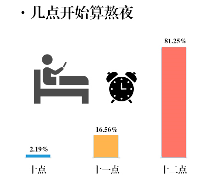 在回答“几点你认为是熬夜”这问题上,超过80%的同学认为12点以后才算熬夜。然而,真相却不是这样因为站在内分泌的角度来看,11点以后再睡就算熬夜了,因为你的身体。所以说,有相当大部分人其实一直在熬着夜却不自知。