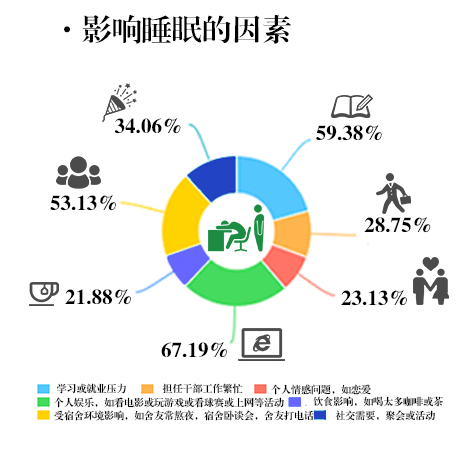 如图表所示,接近7成的人把时间多花在了网上,也有人因忙于社团工作熬夜,而在调查中,我们可以看到睡眠环境的影响占到一半以上。16级新生小鱼同学是一名典型的“夜猫子”,她说:“我一般在学校都不太敢太晚睡,如果有时候有社团的任务就额外算了,如果在家里,凌晨四五点都是常态。”解释原因时,她说道:“一开始只是想躺在床上看会儿小说,看着看着就入迷了,等反应过来就已经四五点了。有时候就是为了打游戏熬夜。”尽管小鱼一直都想改变这种情况,想早早地睡个美容觉,但是拿着手机躺在床上就停不下来,“在学校起码有宿友督促,回到家里就只能靠我自己的自制力了,然而我是那种自制力很差的人,所以回到家就不可能早睡了”,她无奈道。