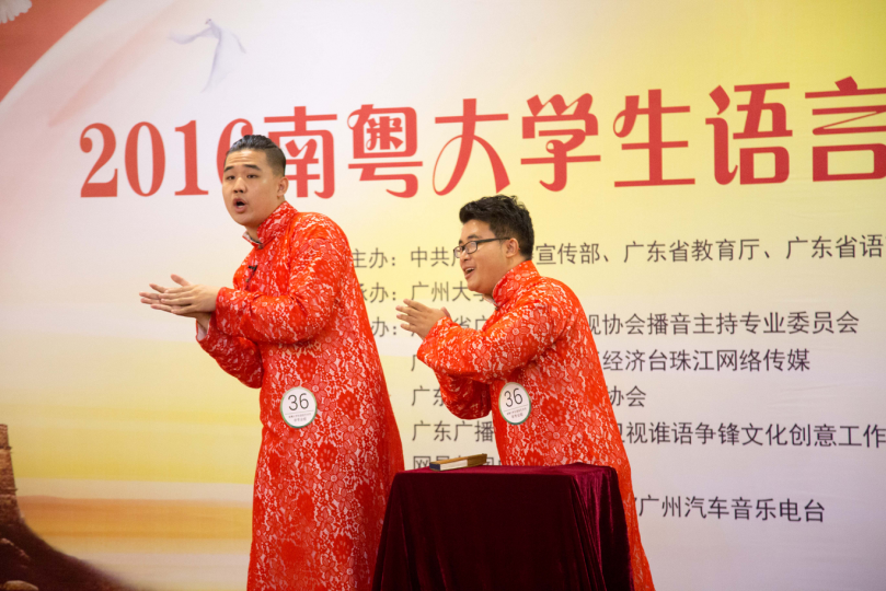 没有选择朗诵,也没有选择戏剧,华南师范大学的王干一和李唯加在决赛现场讲起了相声《满腹经纶》,作为普语非专业组的压轴节目,两人在台上一唱一和,相当默契,语言幽默风趣,逗得观众和评委频频发笑。