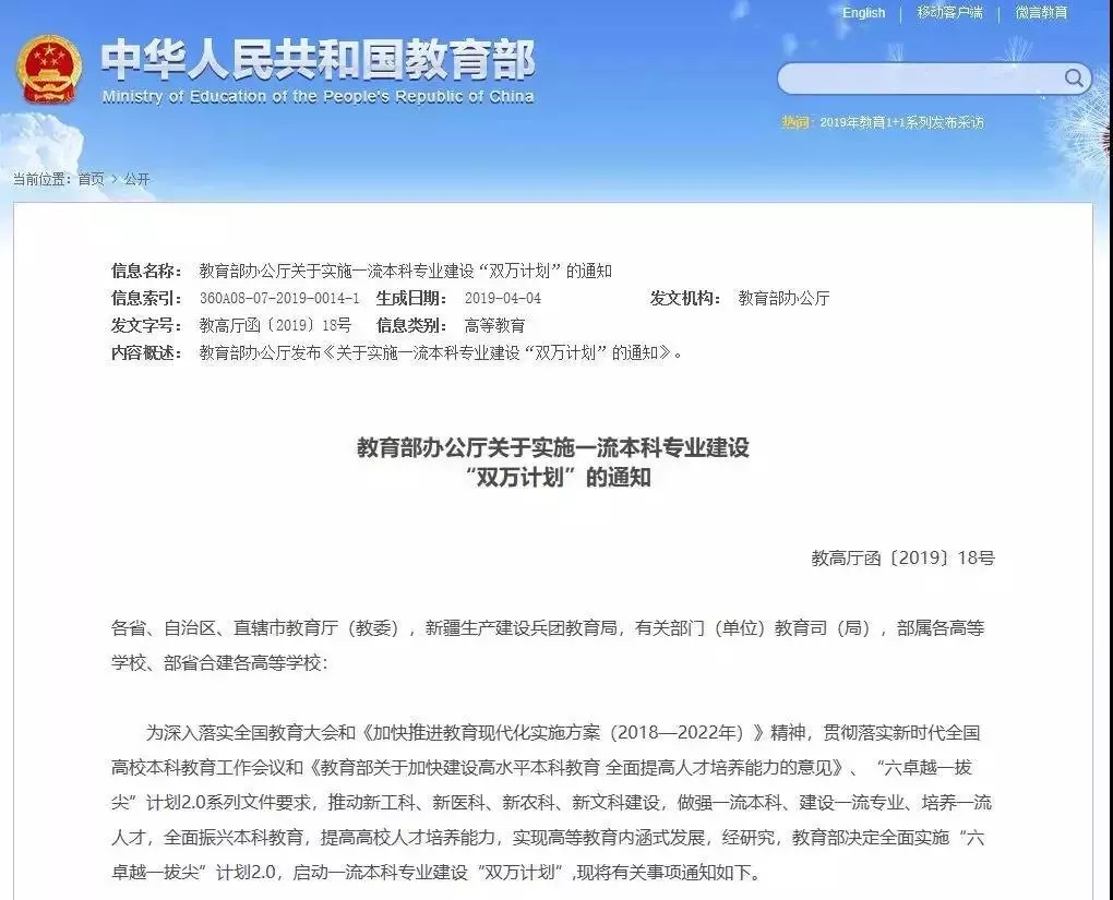 2019年4月,教育部办公厅发布了《关于实施一流本科专业建设“双万计划”的通知》,标志着“双万计划”正式启动。