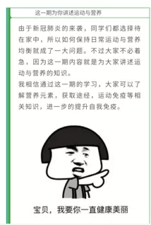 学子编辑体育寒假作业系列推送,表现突出。推送中借用表情包和可爱的排版格式让大家在活跃的气氛中快速了解文章内容,鼓励同学们宅家也要坚持体育锻炼,增强个人免疫力,更好地应对病毒的来袭。