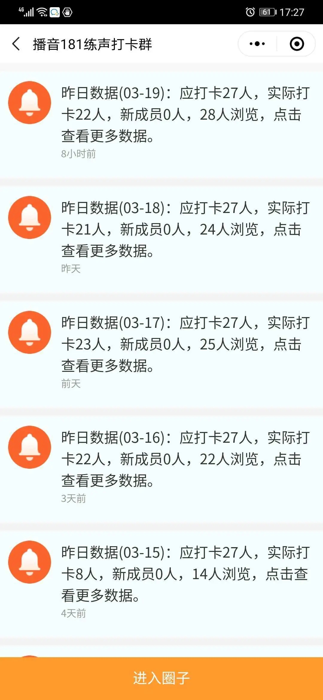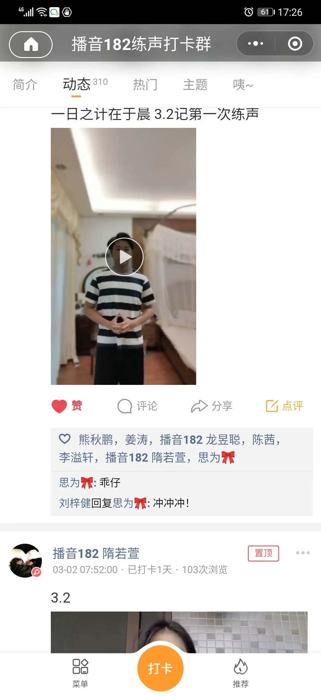防控疫情以来,每周一至周五早晨7:45--7:55是播音与主持专业同学们的练声打卡时间,利用“小打卡”小程序,学生们进入班级打卡群,在规定时间里上传练声照片及视频。“居家学习不能放松专业练习。我会在第二日公布前一天的打卡情况,督促学生坚持早起,坚持出早功。”肖思为表示,打卡平台的群组功能可以对每位打卡成员的照片或视频点赞、点评、分享,方便了师生的交流沟通,既能辅导学生练声,也能关注同学们的身体健康情况。
