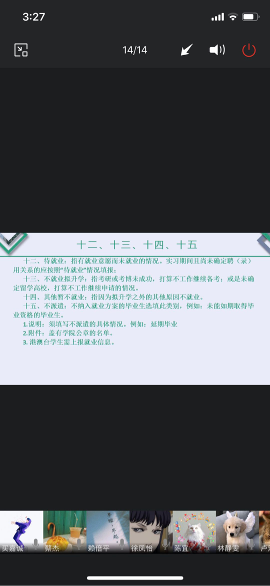 2020年5月19日晚上八点三十分,广电161班召开学习就业相关主题班会。会议由学习委员吴菁桐主持召开,广电161班全体同学参加,班主任刘涛老师也出席了会议并发表讲话。会议中,主持人吴菁桐就毕业生就业信息报送相关内容展开了详细的说明,并通过投屏PPT共享的形式,向同学们展示了相关内容。