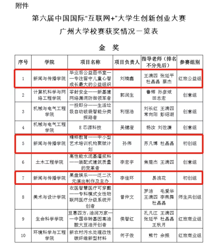 刘楠鑫同学发起的“毕业后公益图书馆——专注留守儿童心智成长最大的公益组织”项目在红旅公益组斩获金奖,苏凡博老师指导的孙伟团队“精粹教育——中小型艺术培训机构聚赋计划”项目、李佳环同学团队的“果盘娱乐——泛二次元演出制作及主办”项目斩获初创组金奖;