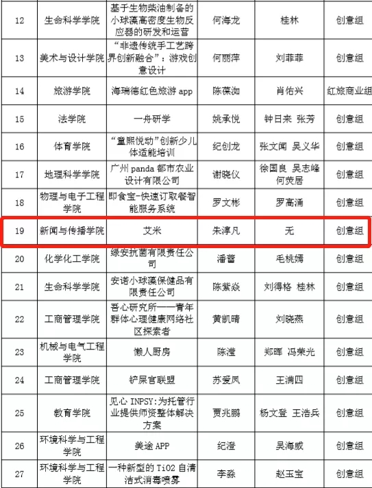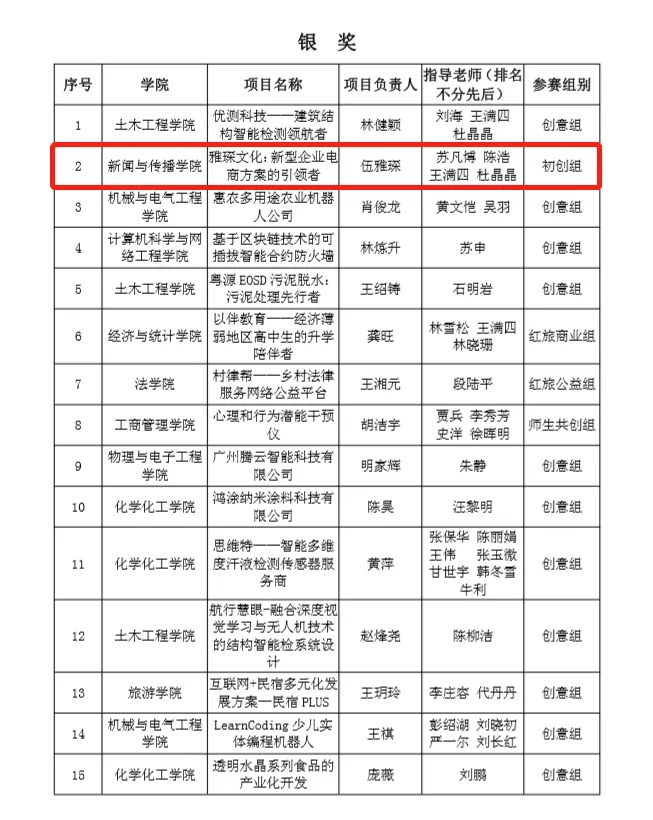 苏凡博、陈浩老师指导的伍雅琛团队“雅琛文化:新型企业电商方案的引领者”项目获得初创组银奖,朱淳凡同学团队的“艾米”项目获创意组铜奖。