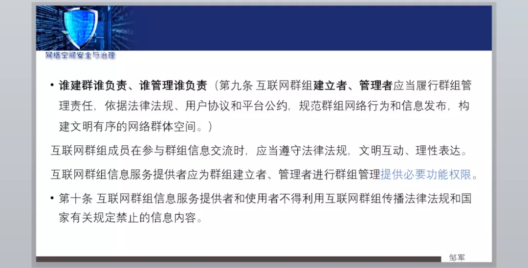 副院长邹军教授。邹军副院长从我国制定的《网络安全法》出发,概述了《网络安全法》的产生背景、基本情况、适用范围以及出台后的影响。随后,他围绕《互联网群组信息服务管理规定》,强调了互联网群组建立者与管理者的责任。最后,他希望做爱自拍