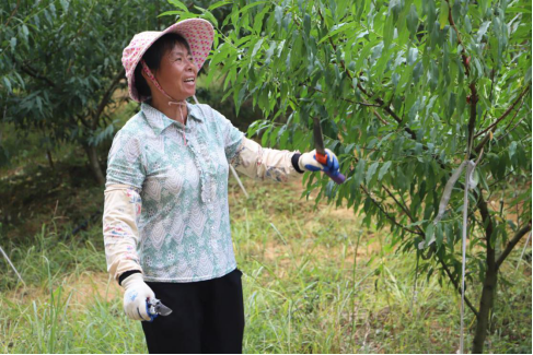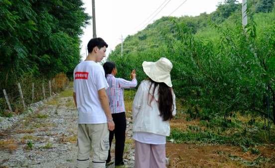 在斜磅村的红雪桃种植基地中,队员们见到了脱贫带头人苏彩群。当时正植下午三点,正是一天中太阳最烈的时候,苏阿姨正在给红雪桃树剪去多余的枝叶。队员们上前一边帮助苏阿姨剪枝,一边和她闲聊着最近的生活。苏阿姨满面春风地向队员们介绍到自己:在奶牛厂的收入已经比较稳定,红雪桃这边的收入也在稳步上升。