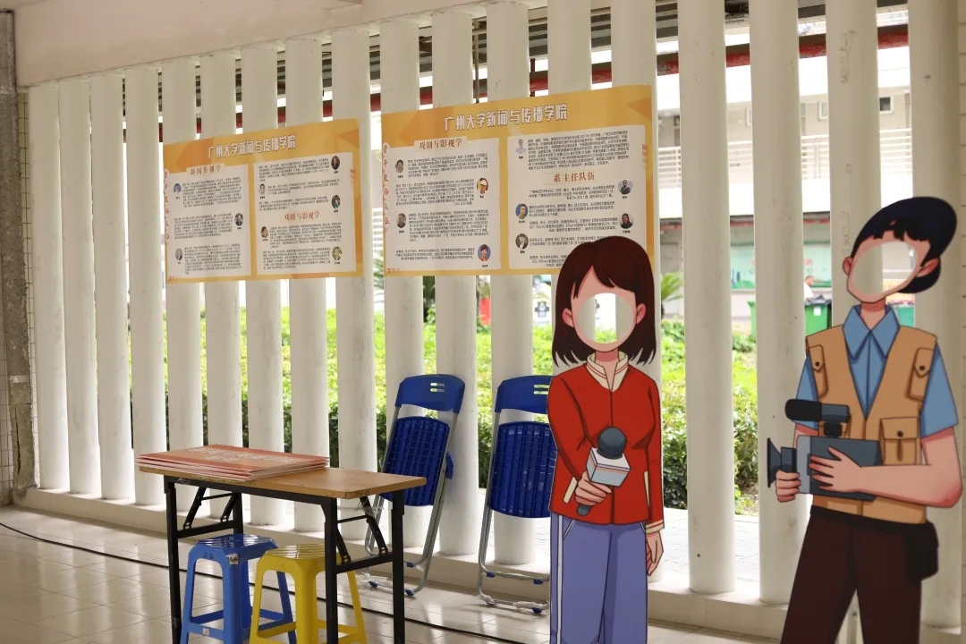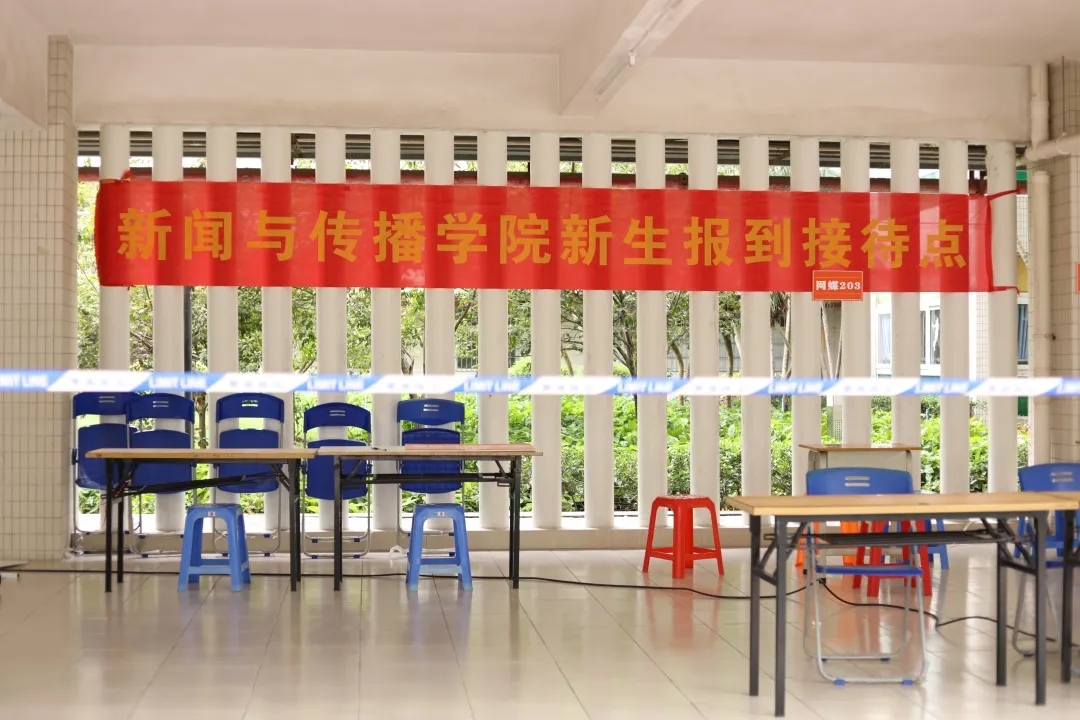 现场布置中,学生干部和志愿者们分工细致,精心准备。现场安排有桌椅以便于新生报到,一旁立有两个记者模样的照相板,充分展现做爱自拍