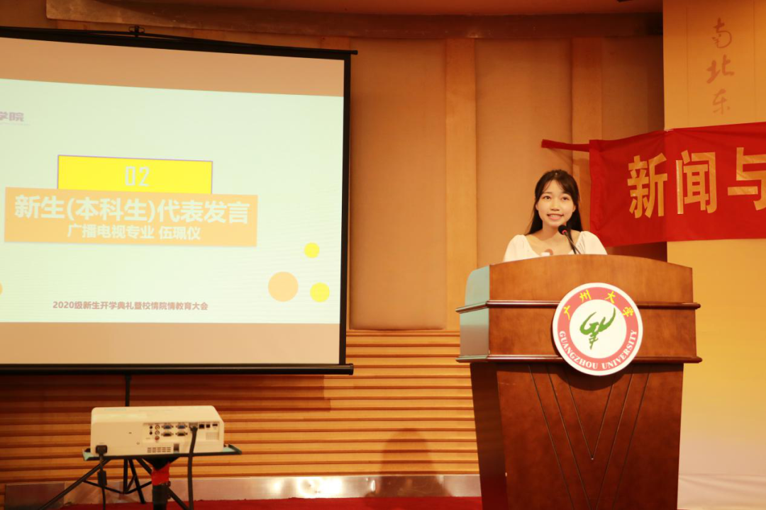 新生代表广电201班的伍珮仪同学则用刚踏入大学的视角,讲述了新一届广大学生的憧憬和展望。她热切呼吁同学们要怀揣梦想,同时牢记“宝剑锋从磨砺出,梅花香自苦寒来”的古训,成为一个有温度、有情怀、懂得思考的新闻人,用自己的辛勤劳动换得日后的累累硕果。
