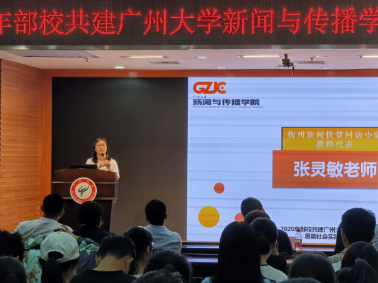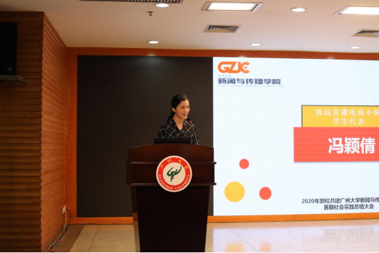 冯颖倩同学汇报了清远小队取得的累累硕果,分享了令她印象深刻的“面孔”:村干部,贫困户,指导老师……一张张鲜活的面孔让她感受到了这场实践活动的温度和人情味。她还说到刘玉萍老师的教导给了她深深的启发:“脚下沾了多少泥土,心中便会沉淀着多少温情。”她表示,在接下来的日子里,希望广大新闻学子能够发挥自己的专业所长,投身于祖国的脱贫攻坚以及乡村振兴的伟大事业中。